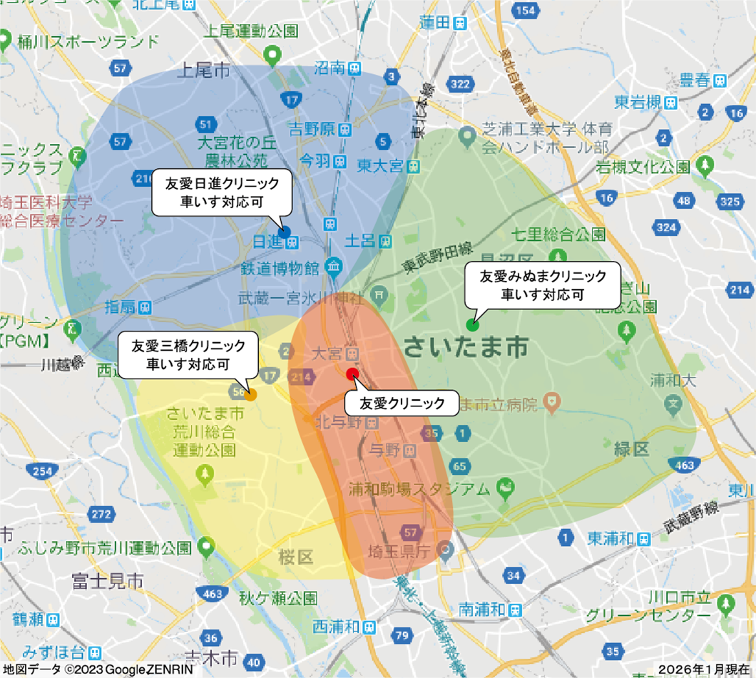 無料送迎バスは4つの透析クリニックすべてで運行しており、送迎エリアはさいたま市内を広くカバーしております。